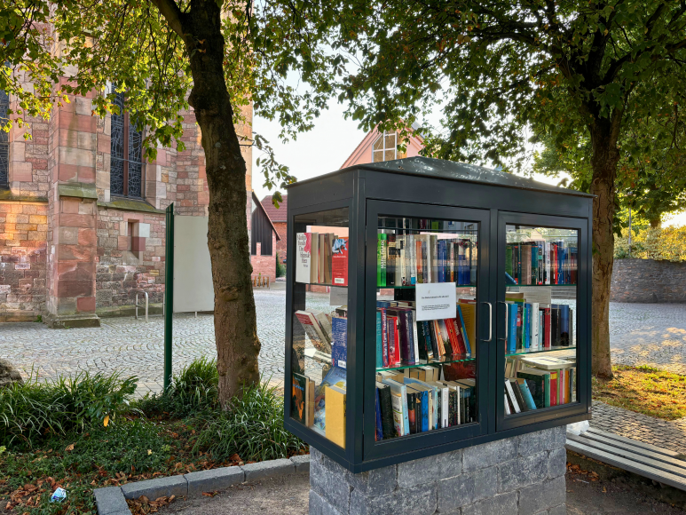 Der Bücherschrank in Hösbach steht zentral am Marktplatz, vor der Kirche und dem Rathaus. Von beiden Seiten zugänglich, lädt er zum Stöbern und Tauschen von Büchern ein. Sitzbänke im Schatten bieten Platz zum Verweilen und unweit befinden sich ein Café sowie eine öffentliche Toilette. Ein gemütlicher Ort für Bücherfreund:innen und eine Pause im Herzen Hösbachs.