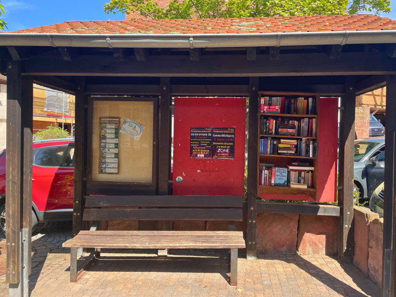 In einem überdachten Häuschen mit Bank befindet sich in Mönchberg ein öffentliches Bücherregal. Dieses gemütliche Plätzchen lädt dazu ein, sich niederzusetzen und gleich in den bereitgestellten Büchern zu schmökern. Der Platz bietet nicht nur Schutz vor dem Wetter, sondern auch eine angenehme Umgebung für literarische Entdeckungen und entspanntes Lesen.