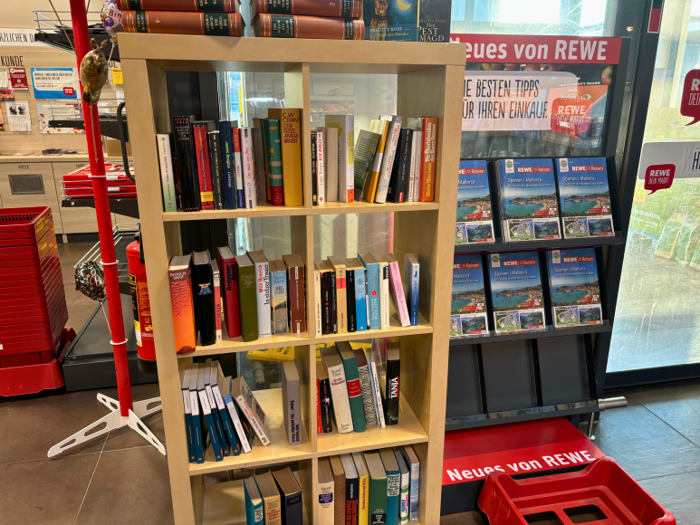 Im REWE, kurz nach der Kasse und vor den automatisch öffnenden Türen, steht ein eher unscheinbares Bücherregal. Es ist leicht zu übersehen, doch es handelt sich um ein öffentliches Bücherregal, das zum Tauschen und Entdecken von Büchern einlädt. Wer es kennt, findet hier eine kleine Oase des Lesens – mitten im Alltag.