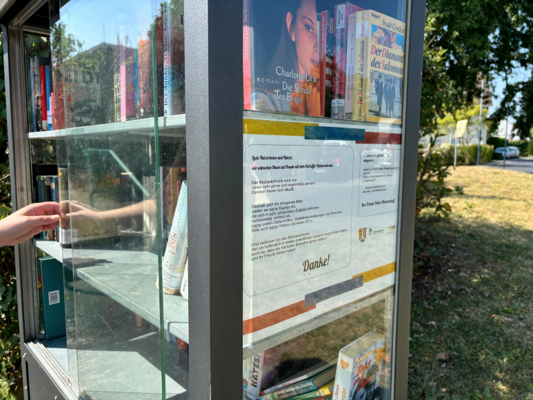 Bücherschränke sind für gut erhaltene Bücher gedacht, die ein breites Publikum begeistern können. Bitte bring keine Zeitschriften, Werbematerial, Atlanten, Schulbücher oder Fachliteratur mit. Ebenfalls unerwünscht sind alte VHS-Kassetten, CDs oder ganze Kisten voller Bücher. Bücher mit rassistischen, gewaltverherrlichenden oder pornografischen Inhalten sind ausdrücklich verboten.