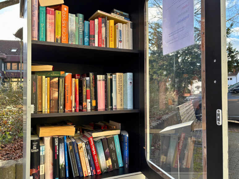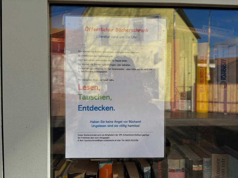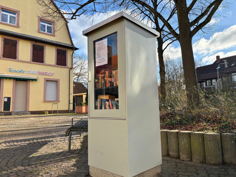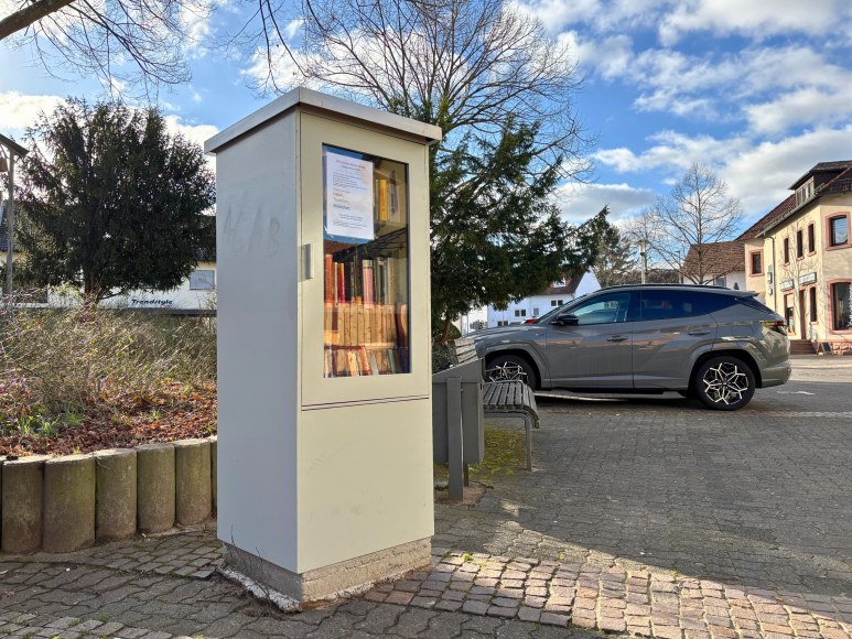 Im Zentrum von Schweinheim, einem Ortsteil von Aschaffenburg, steht ein neuer, eher unscheinbarer grauer Bücherschrank. Trotz seines schlichten Designs lädt er zum Stöbern ein. In der Nähe der Eisdiele und Weinstube gelegen, bietet er zusammen mit den umliegenden Bänken die Möglichkeit, Bücher in entspannter Atmosphäre auszuwählen.
