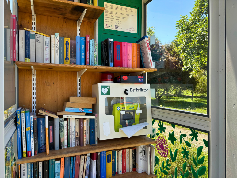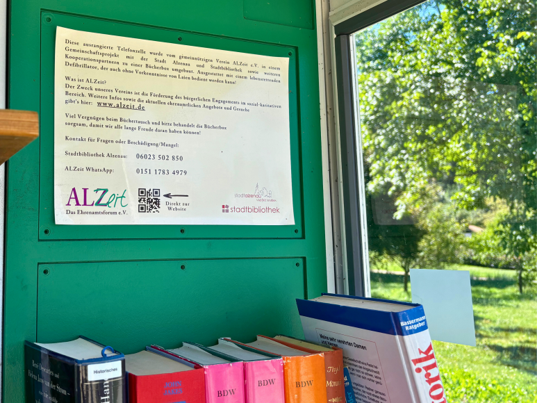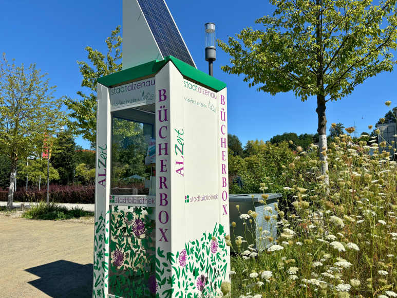 Im Mehrgenerationenpark steht eine farbenfroh bemalte Bücherzelle, die sofort ins Auge fällt. Sie bietet nicht nur Lesestoff für Groß und Klein, sondern ist auch mit einem Photovoltaikpanel auf dem Dach ausgestattet und beherbergt zudem einen Defibrillator. Die ehemalige Telefonzelle wurde liebevoll von ALZeit e.V. in Zusammenarbeit mit der Stadt Alzenau und der Stadtbibliothek zu einer Bücherbox umgestaltet. Ein echtes Gemeinschaftsprojekt, das den Park noch ein Stück lebendiger macht.