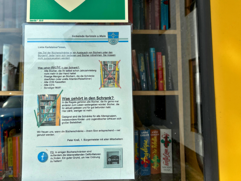 Bücherschränke sind für gut erhaltene Bücher gedacht, die ein breites Publikum begeistern können. Bitte bring keine Zeitschriften, Werbematerial, Atlanten, Schulbücher oder Fachliteratur mit. Ebenfalls unerwünscht sind alte VHS-Kassetten, CDs oder ganze Kisten voller Bücher. Bücher mit rassistischen, gewaltverherrlichenden oder pornografischen Inhalten sind ausdrücklich verboten.