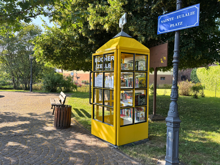 Am Sainte-Eulalie-Platz in Laufach steht eine charmante gelbe Telefonzelle – heute als offene Bücherzelle genutzt. Mit spitzem Dach und kleinen Fenstern wirkt sie fast wie ein kleines charmantes Häuschen. Umgeben von Bäumen lädt eine schattige Bank im Grünen zum Verweilen und Schmökern ein.