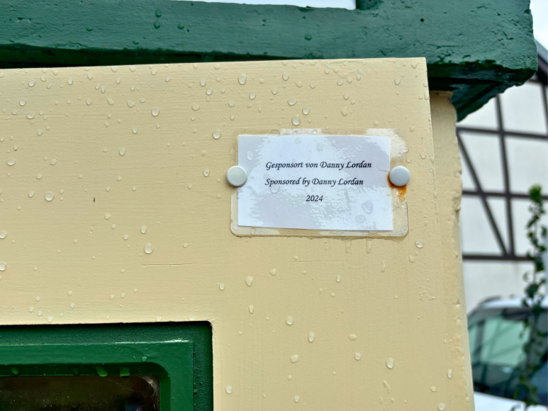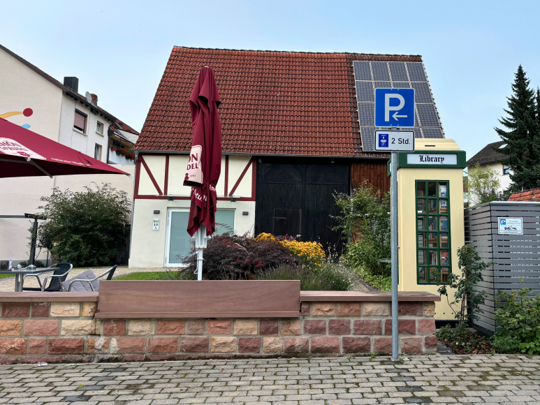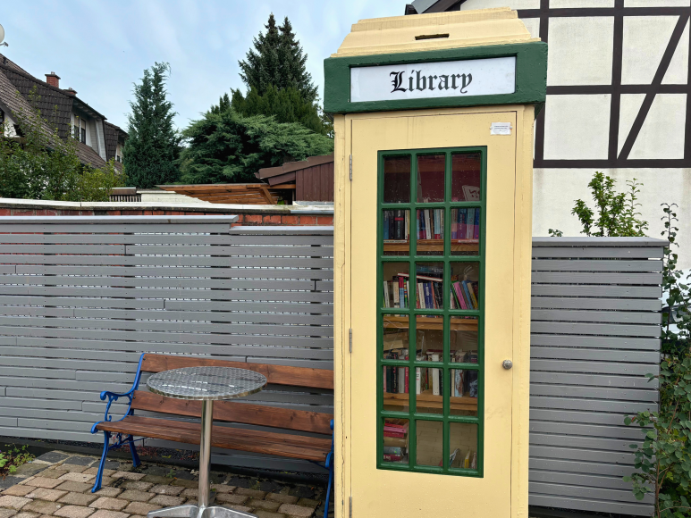 In Waldaschaff steht eine beige-grüne Bücherzelle. Schon von Weitem erkennt man die Zelle an dem „Library“ Schild am oberen Rand. Neben dem Bücherschrank lädt eine Sitzbank mit einem kleinen Tisch zum Verweilen und Schmökern ein. Ein gemütlicher Ort für Bücherfreunde, um in Ruhe neue Lektüre zu entdecken.