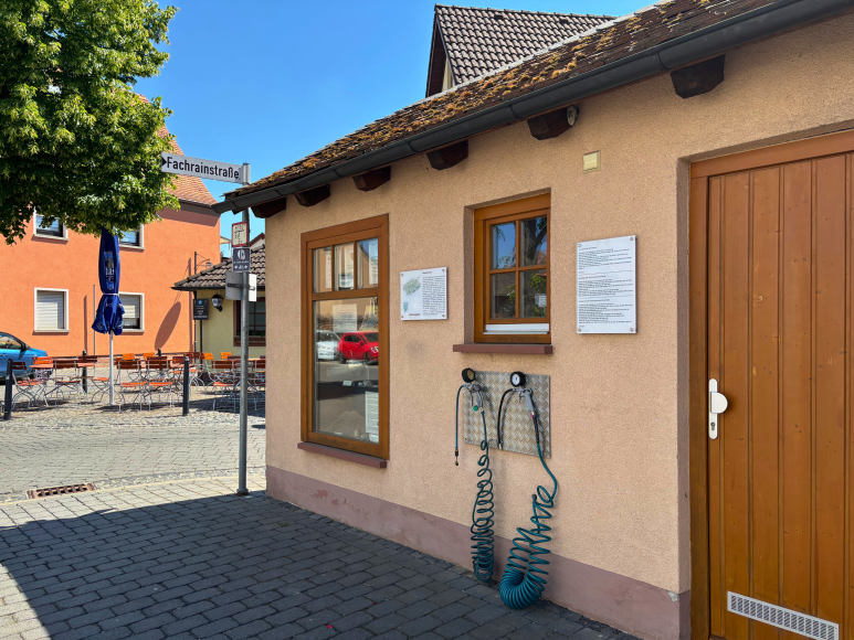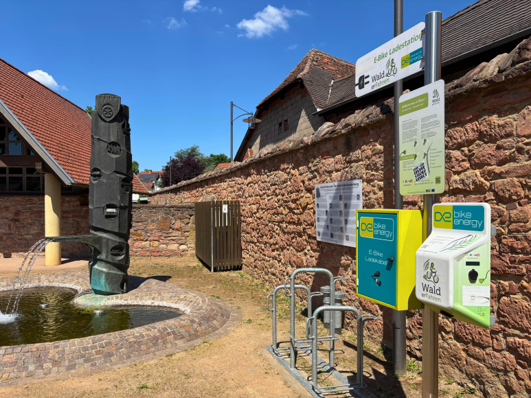 Auf dem Dorfplatz in Niedernberg befindet sich eine E-Bike-Ladestation mit vier Anschlüssen und einer Schuko-Steckdose. Ein kleiner Brunnen und schattige Sitzplätze laden zum Verweilen ein. Die Station liegt außerdem in der Nähe des Mainradwegs und eignet sich perfekt für eine kurze Pause während der Fahrt. An einer Hauswand schräg gegenüber des Platzes befindet sich eine Station, um den Reifendruck zu messen und diese aufzupumpen.
