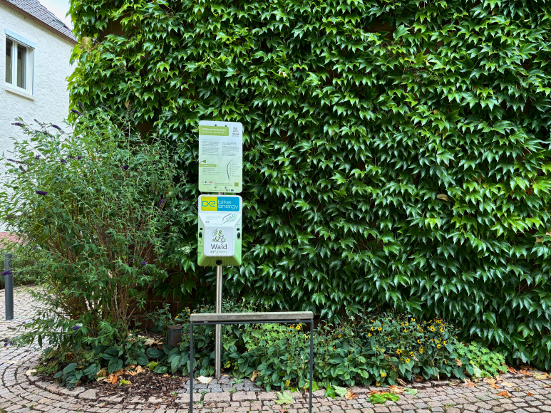 Am Seitengebäude der Gemeindeverwaltung befindet sich eine Ladestation mit zwei Anschlüssen für E-Bikes und einer Schuko-Steckdose. Aufgrund der Fassadenbegrünung ist sie gut in ihre Umgebung integriert und kann auf den ersten Blick leicht übersehen werden.