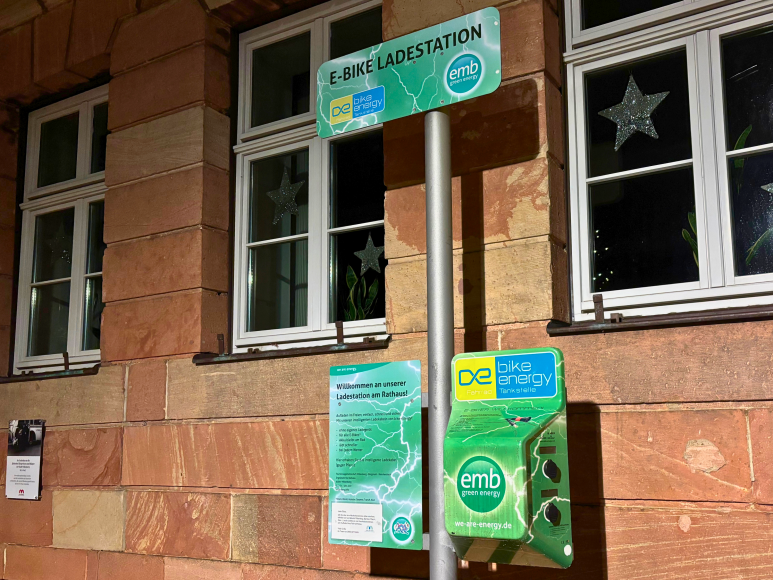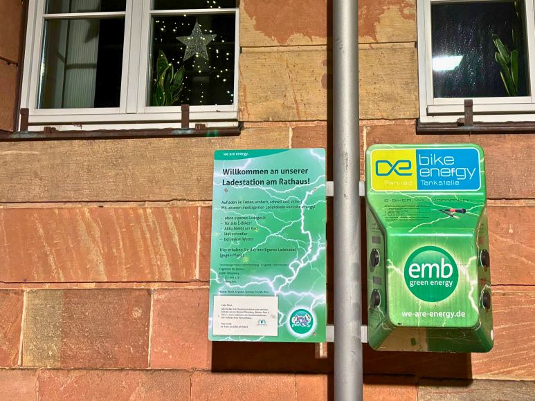 Links vom Eingang des Rathauses befindet sich eine Ladestation, die über vier Anschlüsse für E-Bikes verfügt. Bitte beachte, dass es keine Lademöglichkeit an einer Schuko-Steckdose gibt.