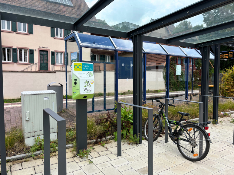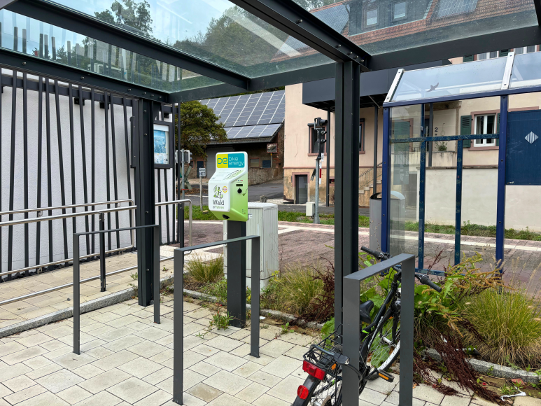 Am überdachten Fahrradstellplatz an der Schimborner Bembelstation befindet sich eine E-Bike Ladestation mit zwei Anschlüssen für E-Bikes und einer Schuko-Steckdose. Sie bietet eine praktische Möglichkeit, ein nachhaltiges Park + Ride mit dem Fahrrad und Zug zu praktizieren.