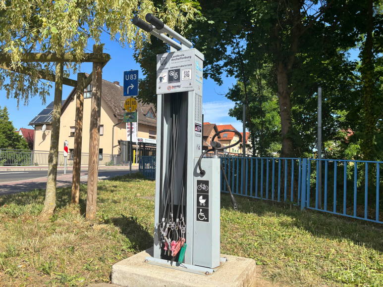 Am Wasserturm in Kahl befindet sich eine E-Bike Ladestation direkt neben der E-Auto Ladestation. Hinter den Ladepunkten steht eine praktische Fahrrad-Servicestation für kleinere Reparaturen oder Wartungen – ideal für Radfahrer auf Tour.