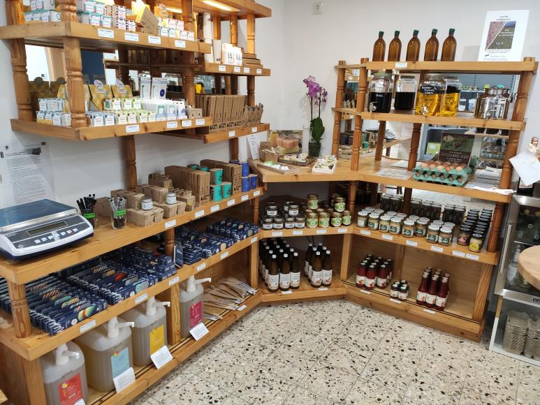 - Nudeln, (Milch-)Reis, Linsen, Müslis, Müslizutaten, Nüsse, Saaten, Mehle, Grieß, Backzutaten, Puddingpulver, Trockenfrüchte, Honig, Senf, Brotaufstriche, Kochzutaten, Süßwaren, Kaffee, Tee, Gewürze, Essige, Öle, Eier, Antipasti, (Heil-)Steine, Klangei usw.