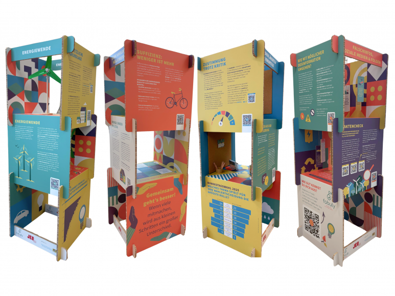 Die Ausstellung besteht aus vier modularen Türmen bzw. Säulen aus stabilem Wabenkarton, die sich unkompliziert zusammenstecken lassen. Sie ist interaktiv gestaltet und lädt Besucher:innen dazu ein, sich persönlich mit dem Thema Energiewende auseinanderzusetzen.